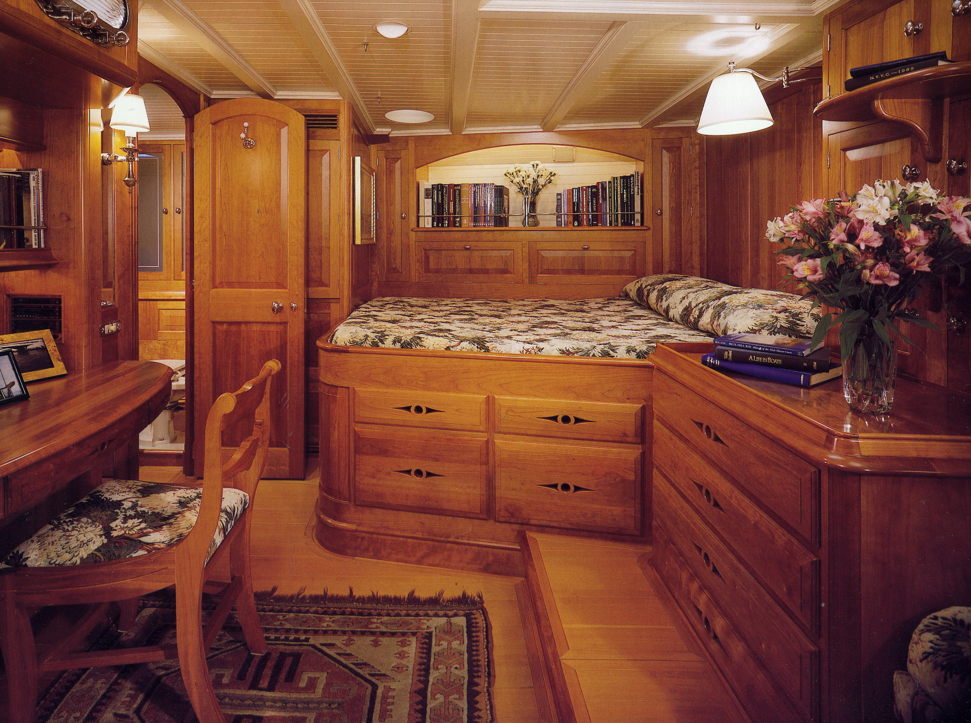 Behind and underneath the fine woodwork, the shipyard’s engineers managed to squeeze in, without compromising to space, engine, generators, heating, air conditioning and more.