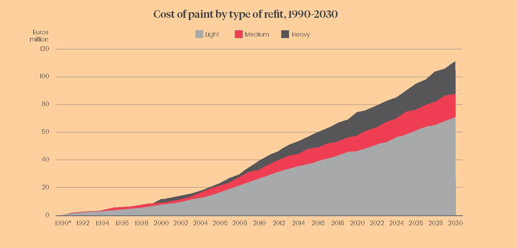 Set against that backdrop, the data shows a layered market driven by distinct refit cycles. Light refits, operating on a one-year cycle, form the foundation. In 2019, annual work accounted for just under 1.9 million litres of exterior paint. By 2025, this rises to 2.38 million litres, reflecting steady but persistent growth.