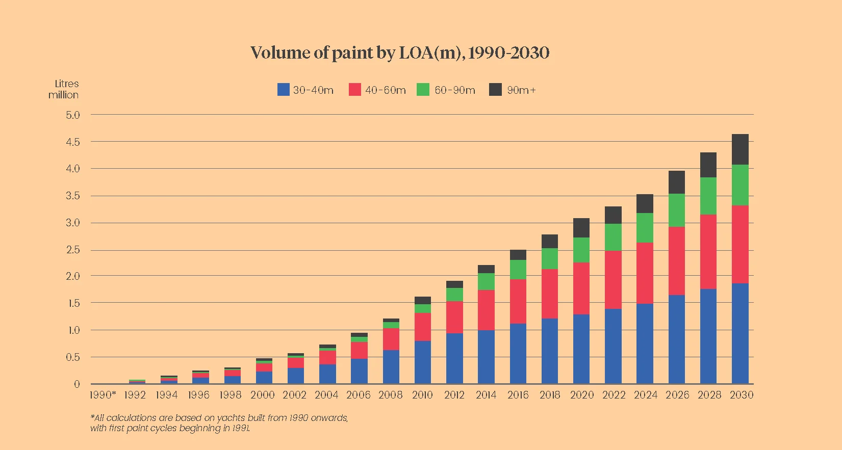 The next five years will add around another 900,000 litres, so there is no sudden break in trend. But by the end of this decade, the refit market is processing close to 5 million litres of paint annually, a level that fundamentally changes the labour, time and capacity required to deliver what remains ostensibly routine work in an already stressed market. Not to mention this data does not explicitly cater to the projected growth of the fleet by LOA. Although it may be a factor to some degree, it’s not necessarily changes to owner behaviour driving this growth, nor is it due to more frequent repainting across the fleet. The main driver is from the interaction between refit cycles and increasing fleet composition.